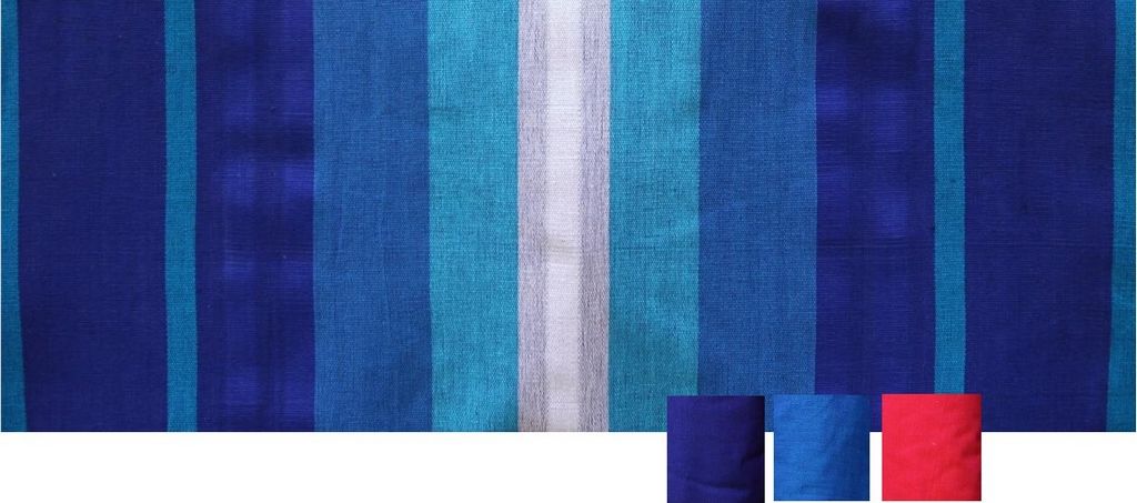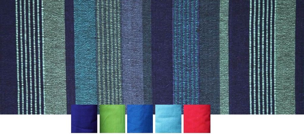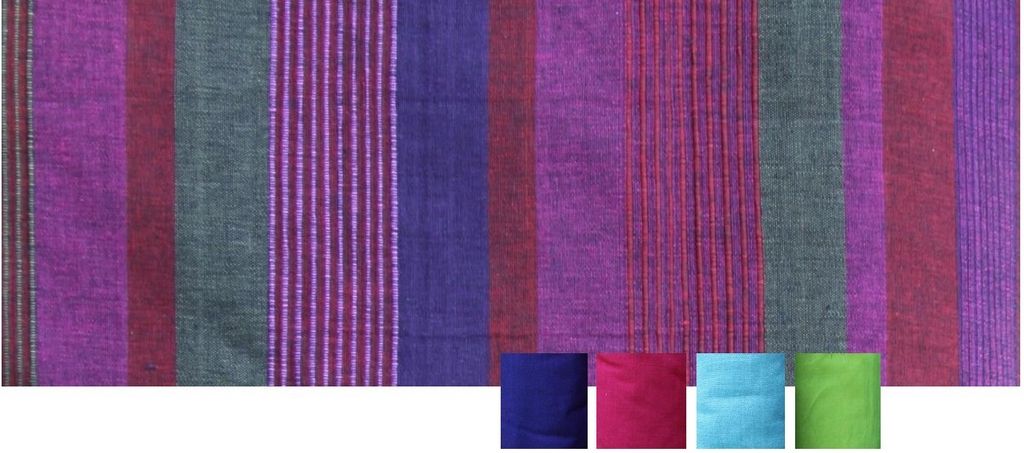 Das Grundmaterial der Stoffe ist 100 % Baumwolle, die in Strängen mit brillanten, giftfreien Farben aus der Schweiz durchgefärbt wird. Dadurch bleiben die Farben sehr lange intensiv und schön.