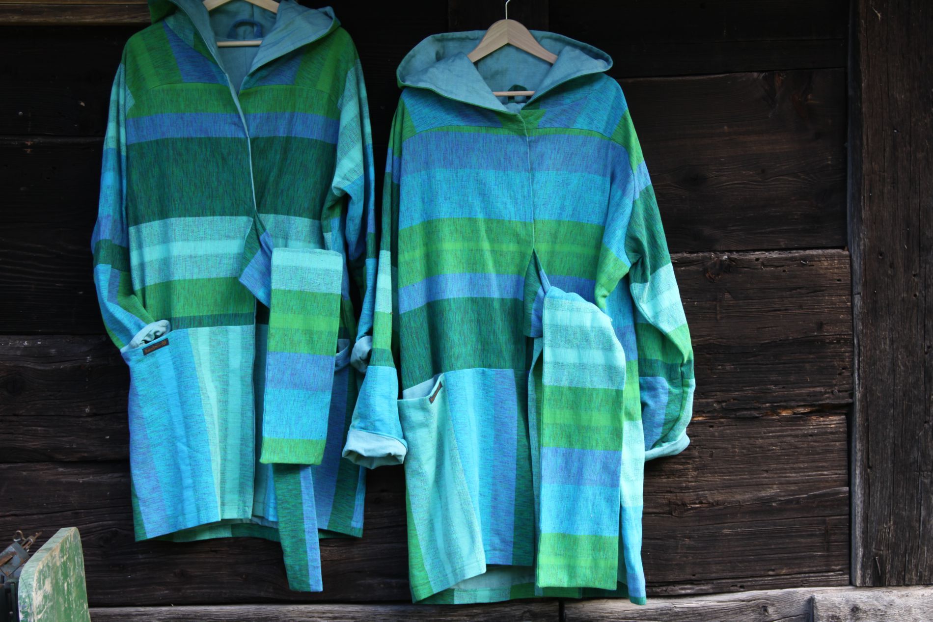 Die dünneren handgewebten Stoffe geben den Kontrast für die Innenseiten der ROBES, der Kapuzentücher, der Ponchos und für die Rückseiten der Decken.
